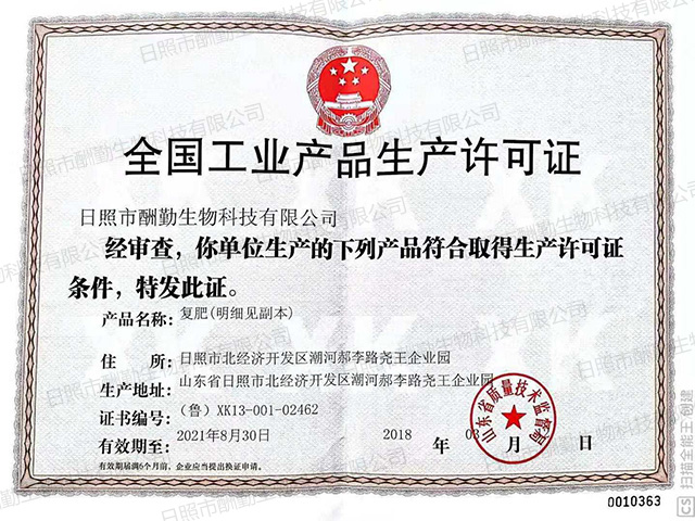 日照市酬勤生物科技有限公司生產(chǎn)許可證正本